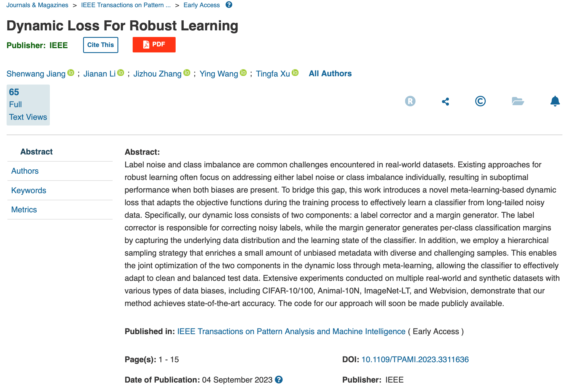 论文详情:S. Jiang, J. Li, J. Zhang, Y. Wang and T. Xu, "Dynamic Loss For Robust Learning," in IEEE Transactions on Pattern Analysis and Machine Intelligence, doi: 10.1109/TPAMI.2023.3311636.