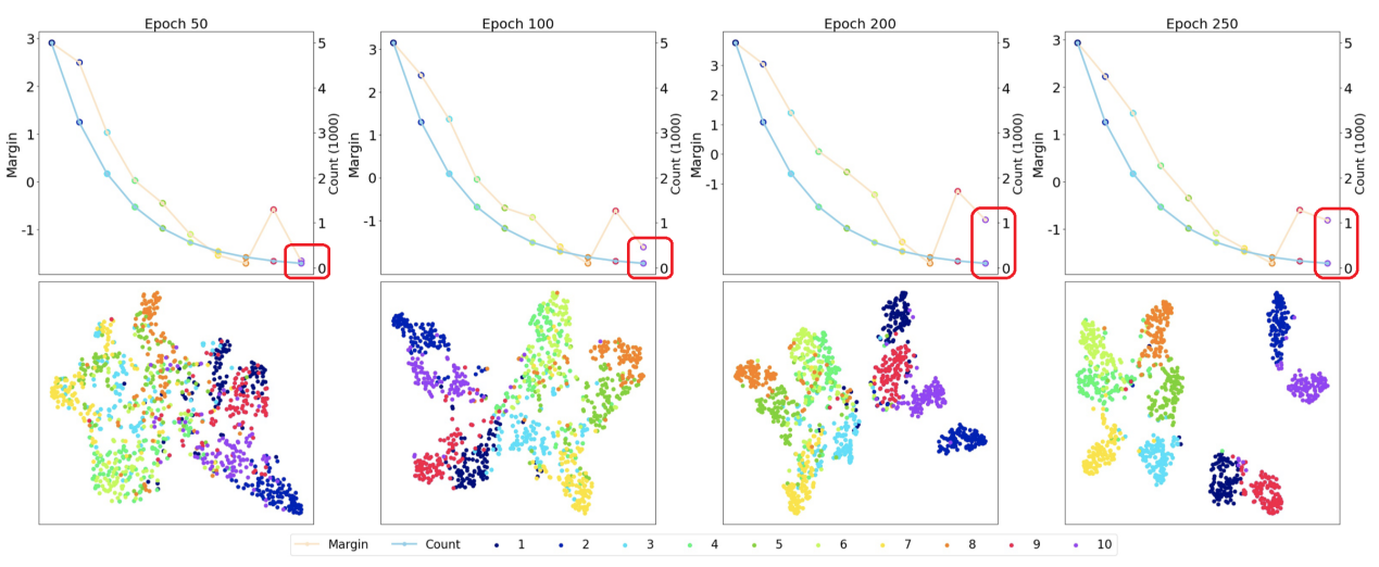 图2展示了分类间隔和特征分布随训练时间的变化图。随着训练过程的推进,间隔生成器主动学习分类难度,自适应增大长尾类别的间隔系数,如图2类别10(折线图标红部分)。模型生成了清晰的类别边界,如图2中的特征分布变化图,显著提升了模型应对长尾噪声数据的鲁棒性。