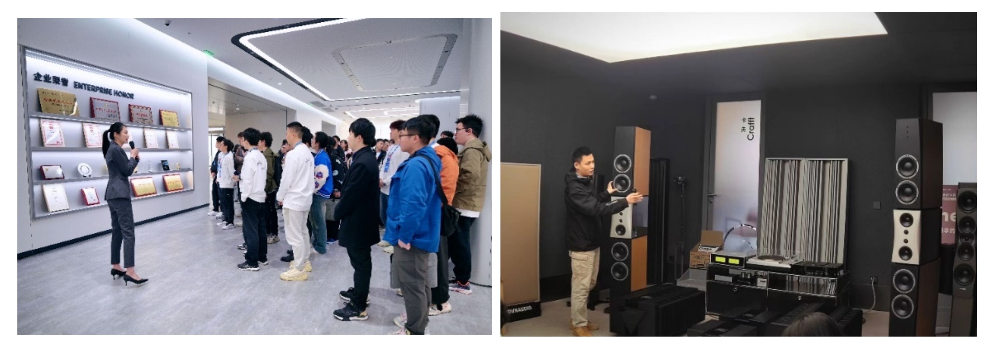 接着,师生一行参观了丹拿实验室。作为全球顶级的音响制造商,丹拿实验室拥有先进的研发设备和优秀的科研团队。在这个充满科技气息的实验室里,师生们近距离观摩了歌尔公司最新的研发成果和创新项目,不仅亲身体验了丹拿实验室的最新音响产品,还与科研人员进行了深入交流,彼此碰撞出思维的火花。