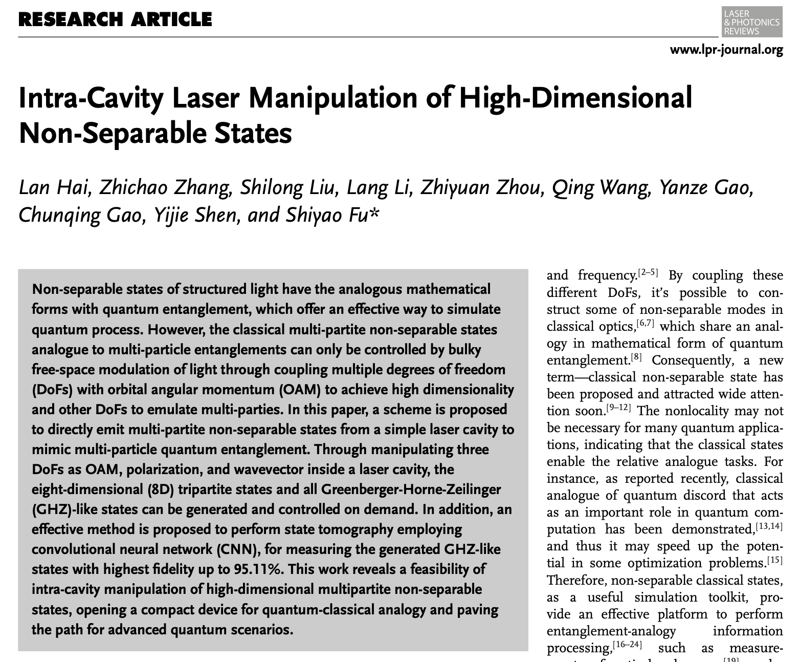 近日,betway西汉姆联官网高春清、付时尧团队联合中国科学技术大学史保森、周志远团队、加拿大蒙特利尔理工学院Shilong Liu博士以及新加坡南洋理工大学Yijie Shen助理教授,在激光谐振腔内光子角动量高维调控研究方面取得显著进展。通过将光子自旋-轨道角动量耦合引入V形激光谐振腔,首次实现了三体八维量子纠缠模拟态,即高维经典不可分离态(Classical non-separable state, CNSS)的激光谐振腔直接输出。该研究成果提供了具有集成性的高维量子态经典模拟源,以"Intra-Cavity Laser Manipulation of High-Dimensional Non-Separable States" 为题发表在光学顶级期刊Laser & Photonics Review(SCI一区,IF:11.0)上。该研究工作得到了国家重点研发计划、国家自然科学基金、北京市自然科学基金、博士后创新人才支持计划等资助。bw必威西汉姆联官方网站是唯一第一作者及通讯作者单位,bw必威西汉姆联官方网站2021级博士研究生海澜、2022级博士研究生张智超为共同第一作者,付时尧研究员为通讯作者。