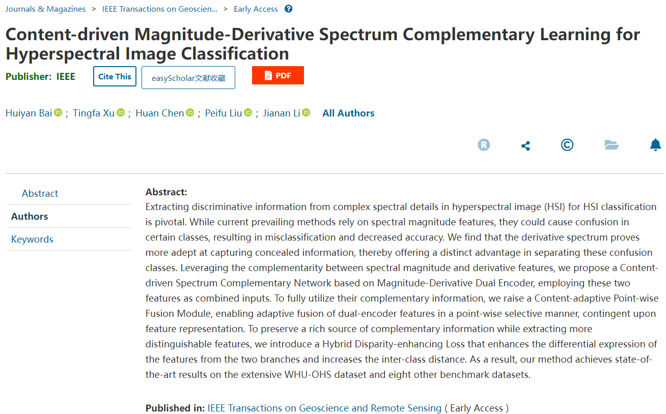 近日,betway西汉姆联官网许廷发教授科研团队在高光谱遥感图像处理领域取得新进展,研究成果以“Content-driven Magnitude-Derivative Spectrum Complementary Learning for Hyperspectral Image Classification”为题发表在遥感领域的国际顶级期刊《IEEE Transactions on Geoscience and Remote Sensing》(IEEE TGRS)上。该工作第一作者为bw必威西汉姆联官方网站硕士研究生白荟琰,通讯作者为bw必威西汉姆联官方网站许廷发教授和李佳男特别副研究员。