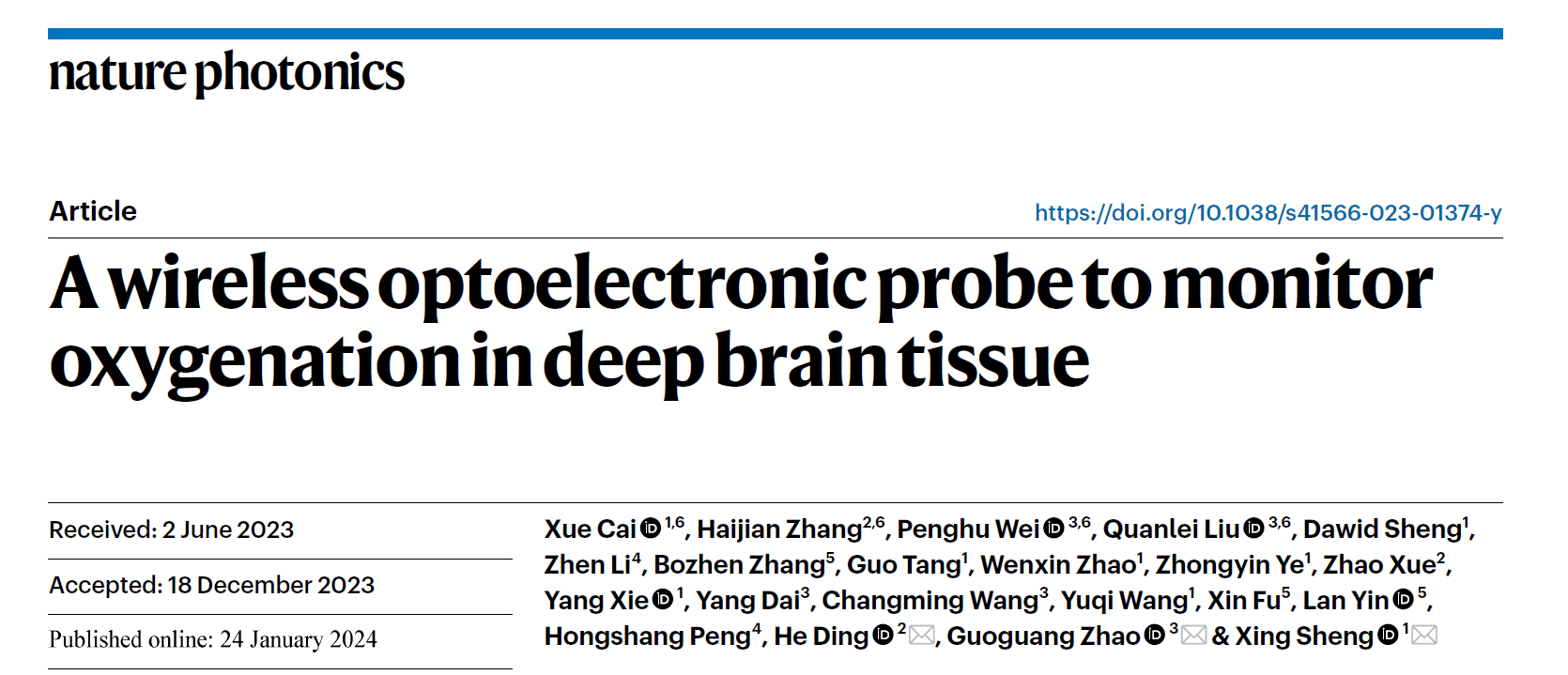 近日,betway西汉姆联官网王涌天、杨健教授团队成员丁贺副教授、首都医科大学宣武医院赵国光教授和清华大学盛兴副教授共同合作,开发了一种植入式微型光电探针系统,可在自由活动的动物深层脑组织中无线、连续、实时监测脑组织氧分压,并揭示了癫痫状态下动物脑内神经活动与局部氧代谢的耦合规律。研究成果以《Wireless Optoelectronic Probe to Monitor Tissue Oxygenation in Deep Brain Tissue》为题发表在Nature Photonics期刊上。