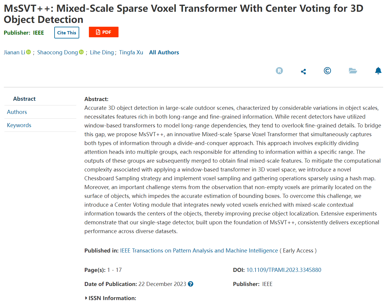 为了解决真实大规模场景下基于激光雷达点云数据的3D目标检测难题,betway西汉姆联官网的许廷发教授科研团队开展了人工智能3D目标检测方法研究,取得了突破性进展。该研究成果以题为“MsSVT++: Mixed-scale Sparse Voxel Transformer with Center Voting for 3D Object Detection”的论文形式发表在国际顶级期刊《IEEE Transactions on Pattern Analysis and Machine Intelligence》上。IEEE TPAMI作为人工智能、模式识别和图像处理等领域的顶级权威期刊,其影响因子为23.6,是中国计算机协会(CCF)推荐的人工智能领域A类期刊。论文的第一作者为bw必威西汉姆联官方网站李佳男副研究员,通讯作者为许廷发教授。