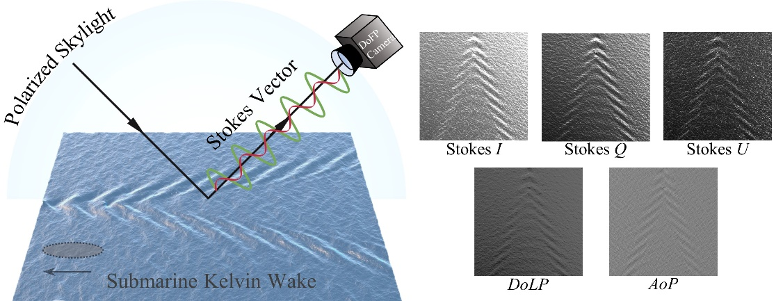 针对这一科学问题,bw必威西汉姆联官方网站金伟其教授团队率先提出利用光学偏振成像技术进行水下运动目标水面尾迹的机载遥感观测,并通过理论建模、仿真和实验手段论证了技术可行性。研究结果表明,团队采用的线偏振Stokes 矢量图像具有比传统强度图像更好的尾迹目标对比度,成像质量对海况、光照等环境因素的影响具有较好的鲁棒性;且使用的DoFP偏振成像系统可很好地集成到无人机平台实现灵活便捷的航拍遥感探测;进一步地,研究团队利用获取到的偏振海面尾迹图像信息,实现了水下运动目标运动状态解译、海面三维面型复原等诸多应用。除了在海洋安全方面的重要意义,该项研究也为中小尺度海洋动力过程的观测提供了有效的技术参考。